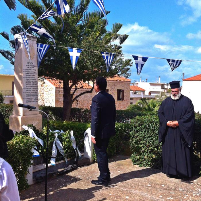 | Καταθέτοντας δάφνινο στεφάνι στο Ηρώο των πεσόντων υπέρ Πατρίδος του χωριού καταγωγής μου, ως Πρόεδρος του εξωραϊστικού συλλόγου της παραλίας του "η Αγία Μαρίνα". 25/3/2016 |